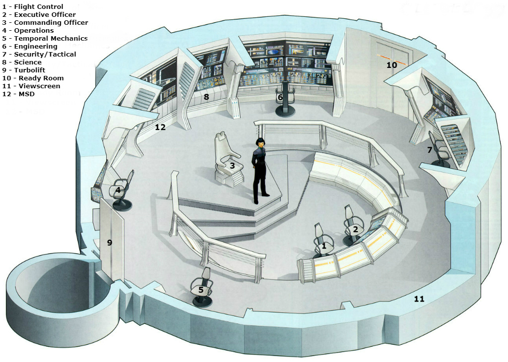 | Description | The Bridge is the command center of the Herodotus. Due to the amount of technology on the vessel and the size of the vessel the bridge is small and compact. The command seat is in the center of the room, with the CONN console and a Situational Readout for the XO directly in front. In front of the CONN and XO consoles is the viewscreen. Left of the Command seat and fore is the Security/Tactical console. As we walk aft from there we come to the Engineering console followed by the Science console, in the lower section of the Science console is a chair that can be slid out from the panel. Directly next to the Science console is the Master Systems Display or MSD. Walking forward of the MSD and right of the Command seat we find the Operations station. With the Temporal Mechanics station fore of that. There is a turbolift access to the bridge as well as a door that leads to the Captains Ready Room. |
